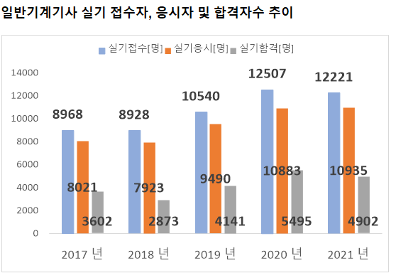일반기계기사 실기시험 접수자는 2021년 기준 12221명 입니다. 그리고 이중 실제로 일반기계기사 실기시험에 응시한 실기 응시자수는 10935명 입니다.