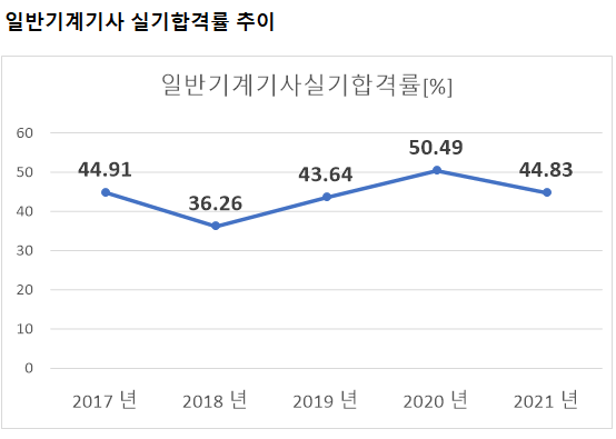 2021년 기준 일반기계기사 실기 합격률은 44.83% 입니다.