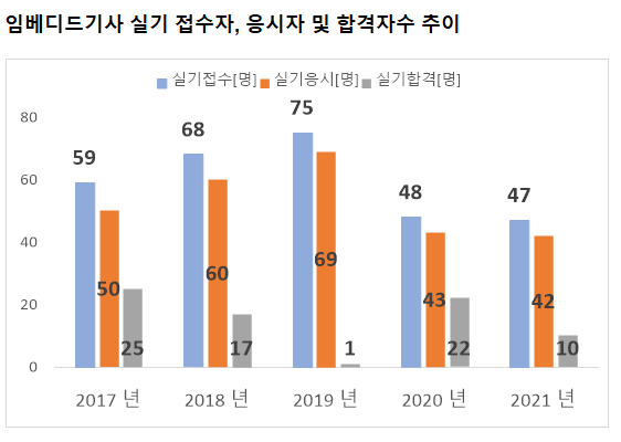 임베디드기사 실기시험 접수자는 2021년 기준 47명 입니다. 그리고 이중 실제로 임베디드기사 실기시험에 응시한 실기 응시자수는 42명 입니다.