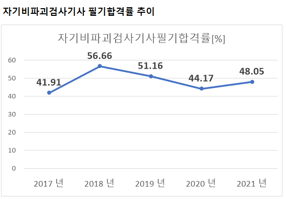 자기비파괴검사기사 필기시험 합격률을 보면 2021년 기준 48.05%의 합격률을 기록하였습니다.