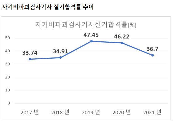 2021년 기준 자기비파괴검사기사 실기 합격률은 36.7% 입니다.