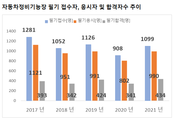 그리고, 자동차정비기능장 필기시험에 최종 합격한 자동차정비기능장 필기 합격자수는 2021년 기준 434명 입니다.