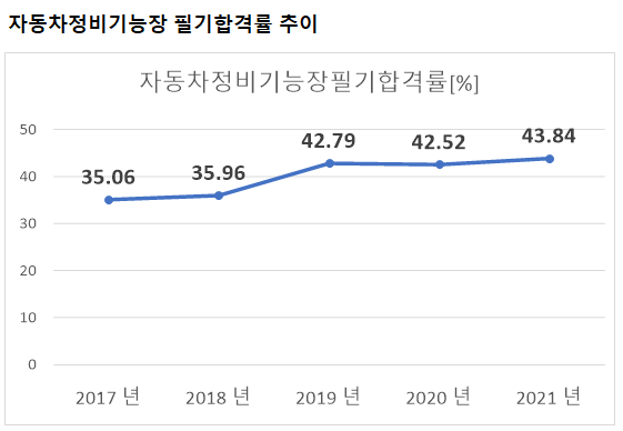 자동차정비기능장 필기시험 합격률을 보면 2021년 기준 43.84%의 합격률을 기록하였습니다.