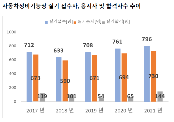 자동차정비기능장 실기시험 접수자는 2021년 기준 796명 입니다. 그리고 이중 실제로 자동차정비기능장 실기시험에 응시한 실기 응시자수는 730명 입니다.