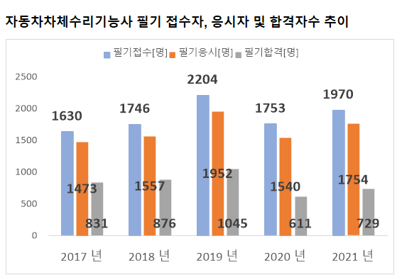 그리고, 자동차차체수리기능사 필기시험에 최종 합격한 자동차차체수리기능사 필기 합격자수는 2021년 기준 729명 입니다.
