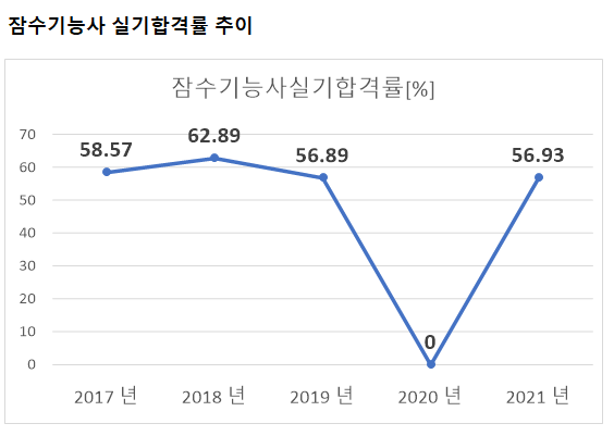 2021년 기준 잠수기능사 실기 합격률은 56.93% 입니다.