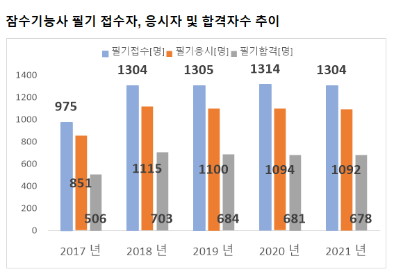 2021년 기준 잠수기능사 필기시험 접수자는 1304명 이었으며, 이중 실제로 잠수기능사 필기시험에 응시한 응시자수는 1092명 입니다.