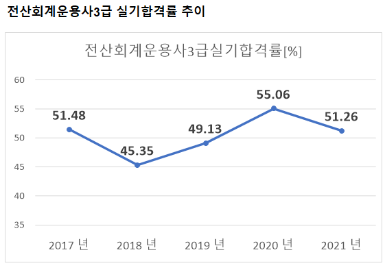 2021년 기준 전산회계운용사3급 실기 합격률은 51.26% 입니다.