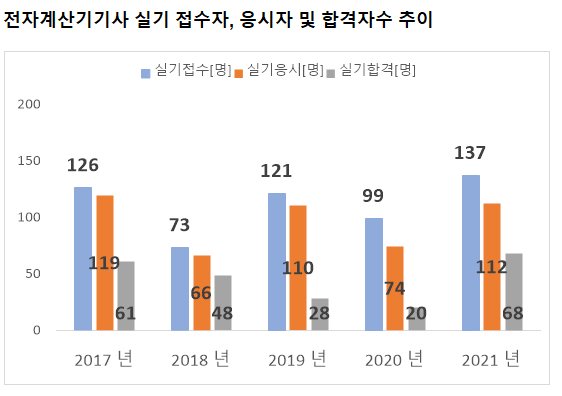 전자계산기기사 실기시험 접수자는 2021년 기준 137명 입니다. 그리고 이중 실제로 전자계산기기사 실기시험에 응시한 실기 응시자수는 112명 입니다.