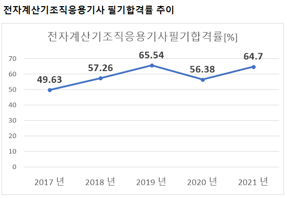 전자계산기조직응용기사 필기시험 합격률을 보면 2021년 기준 64.7%의 합격률을 기록하였습니다.