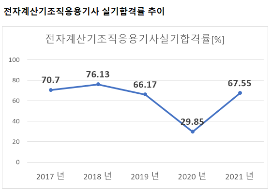 2021년 기준 전자계산기조직응용기사 실기 합격률은 67.55% 입니다.