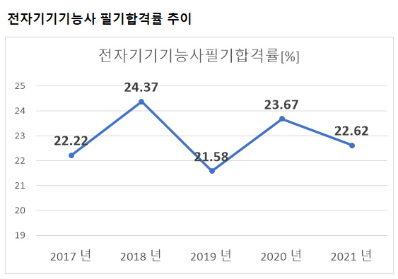 전자기기기능사 필기시험 합격률을 보면 2021년 기준 22.62%의 합격률을 기록하였습니다.