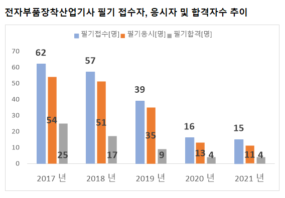 그리고, 전자부품장착산업기사 필기시험에 최종 합격한 전자부품장착산업기사 필기 합격자수는 2021년 기준 4명 입니다.
