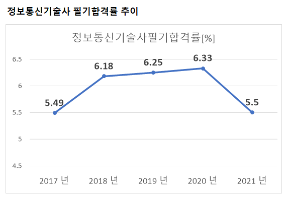 정보통신기술사 필기시험 합격률을 보면 2021년 기준 5.5%의 합격률을 기록하였습니다.