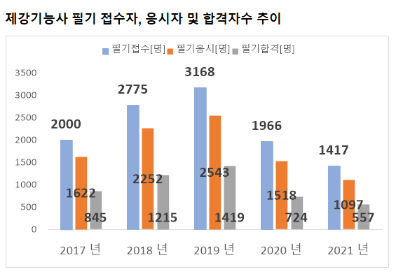 그리고, 제강기능사 필기시험에 최종 합격한 제강기능사 필기 합격자수는 2021년 기준 557명 입니다.